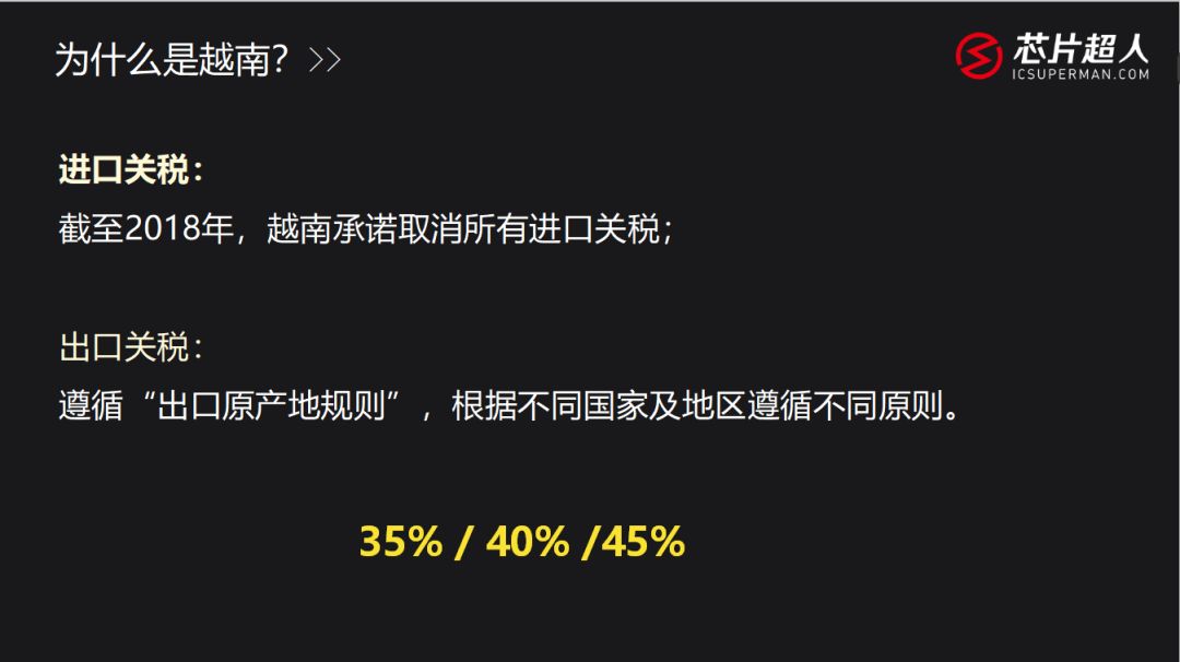 我們關(guān)心的是中國(guó)廠商入駐越南,產(chǎn)品有些核心零部件在國(guó)內(nèi)生產(chǎn),出口越南再去進(jìn)一步組裝,之后再把產(chǎn)品賣到日本或者美國(guó)去,那會(huì)不會(huì)有關(guān)稅?這個(gè)是要根據(jù)這個(gè)產(chǎn)品本身零部件價(jià)值去判斷,看看它們是否有認(rèn)證標(biāo)準(zhǔn)和評(píng)估標(biāo)準(zhǔn),如果通過(guò)認(rèn)證,拿到越南原產(chǎn)國(guó)證明,就不存在加關(guān)稅的說(shuō)法。