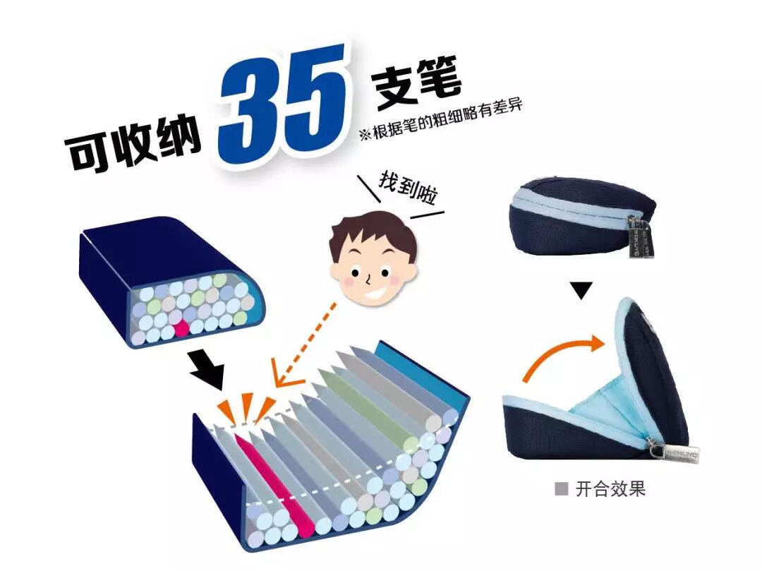 特殊構(gòu)造,打開筆袋時,底面很寬,所以能立刻找到需要的筆。